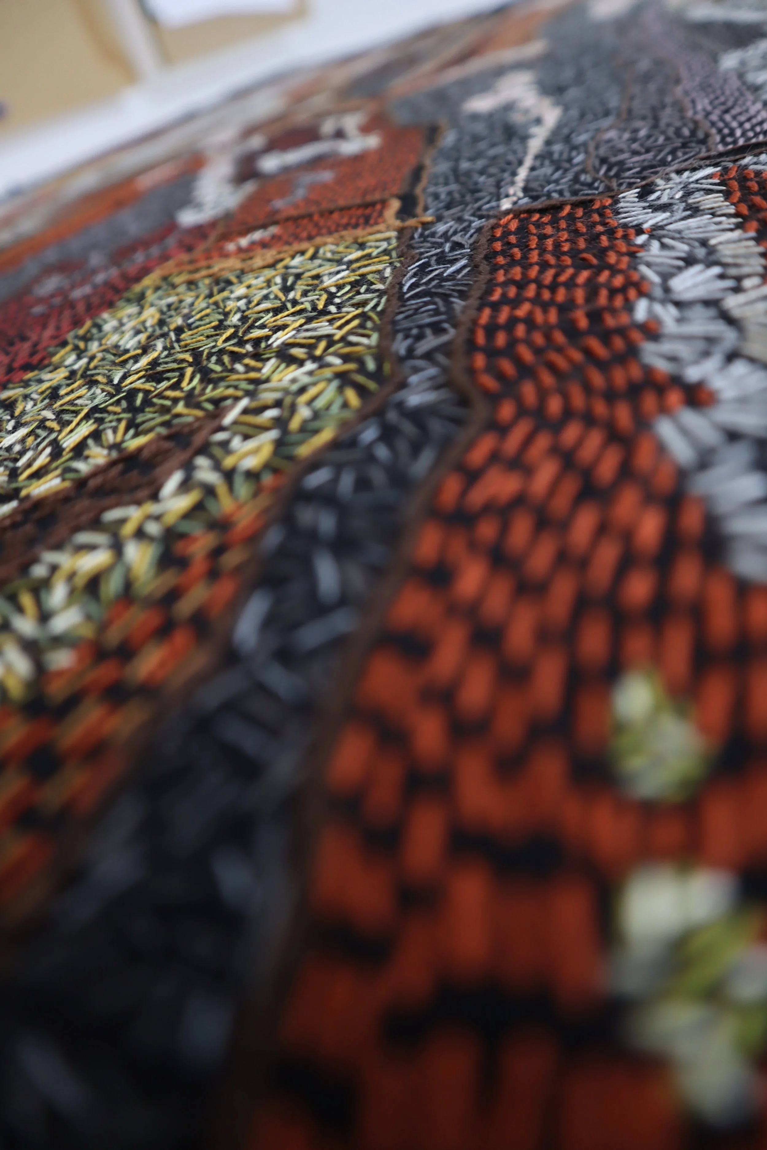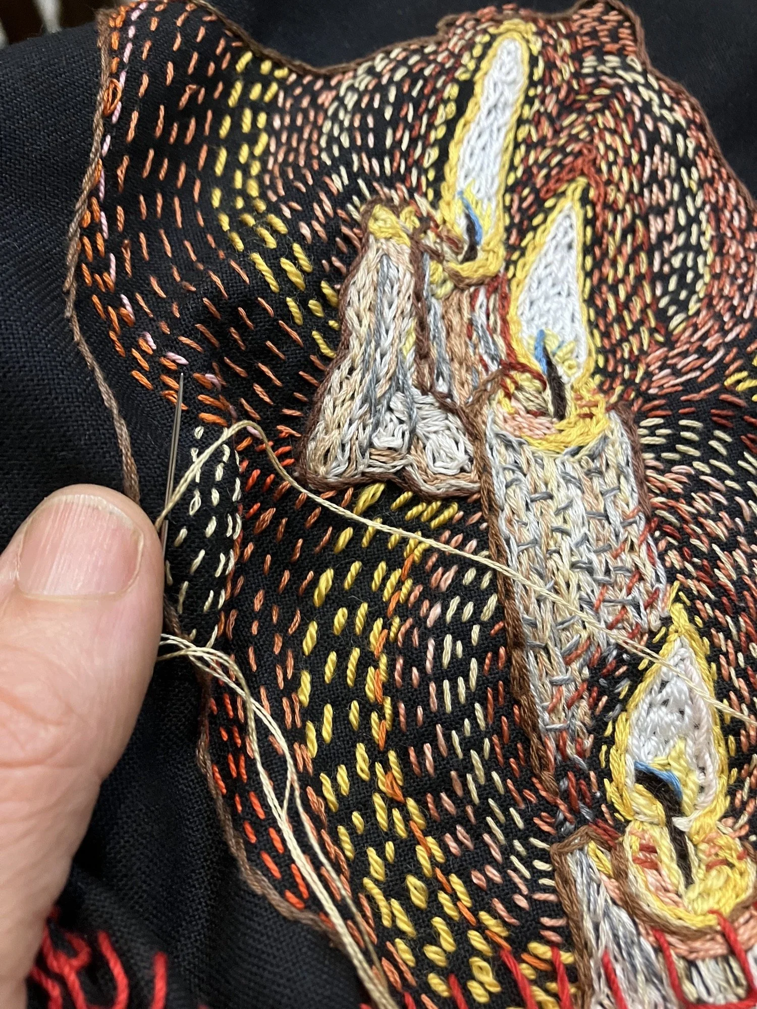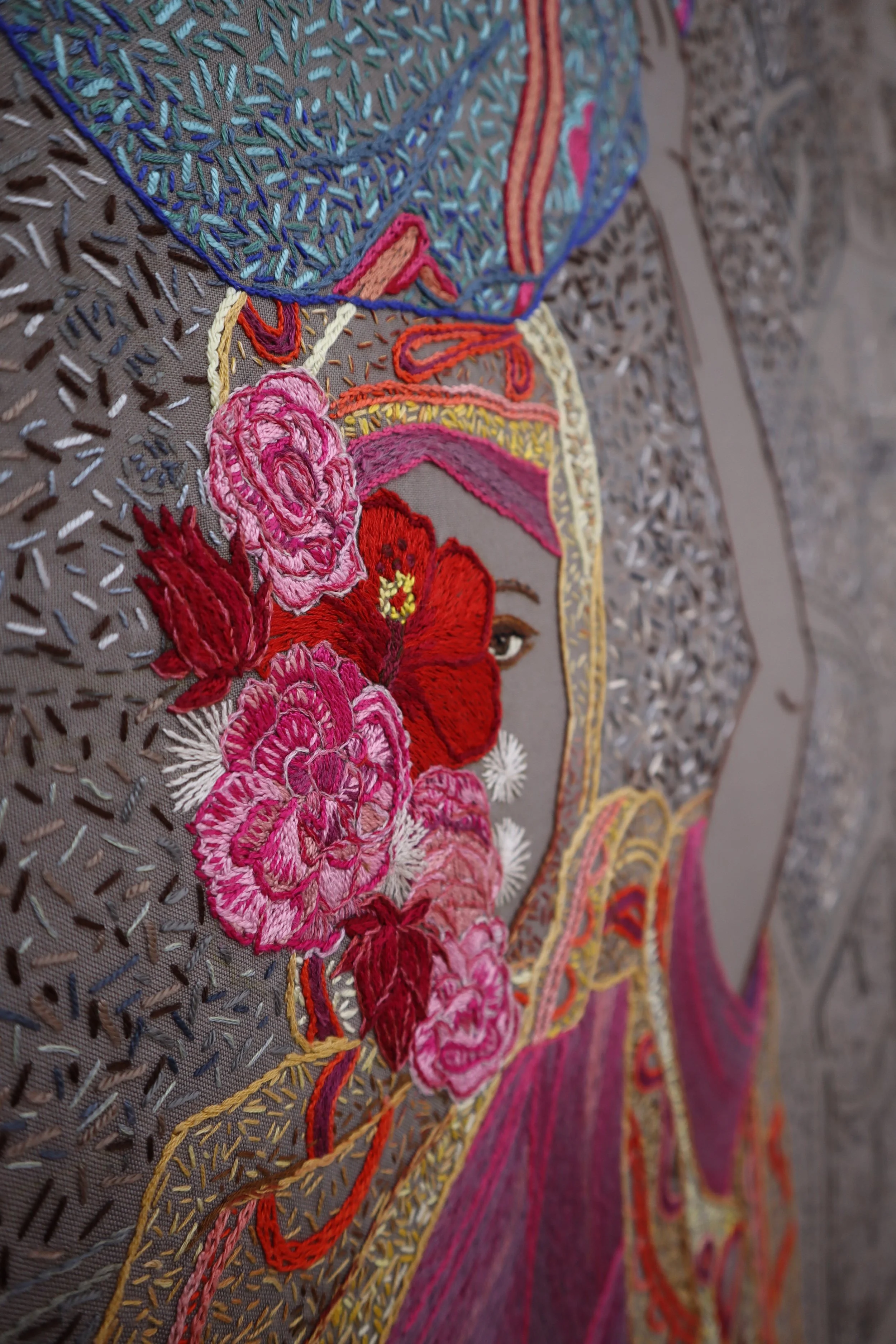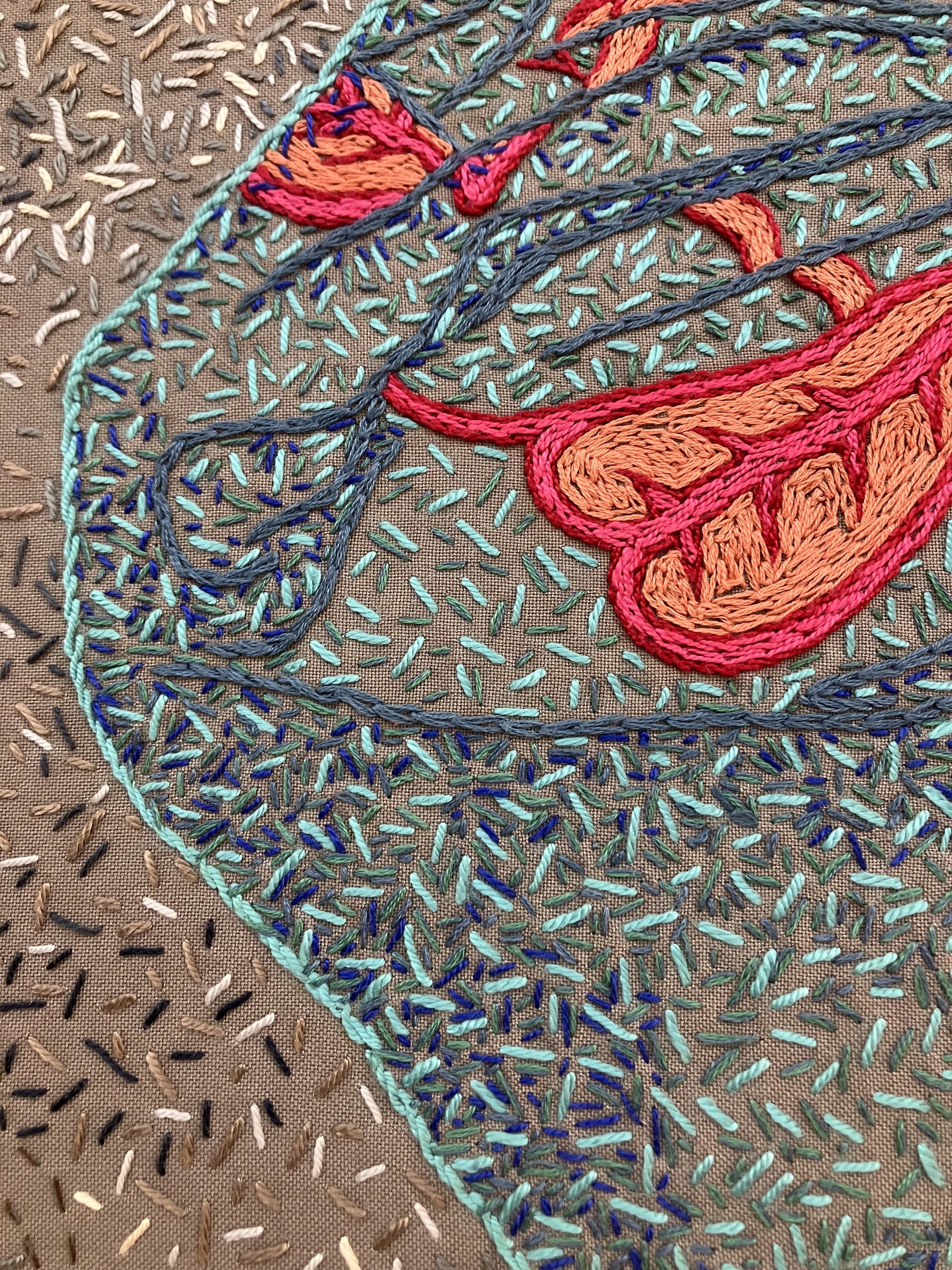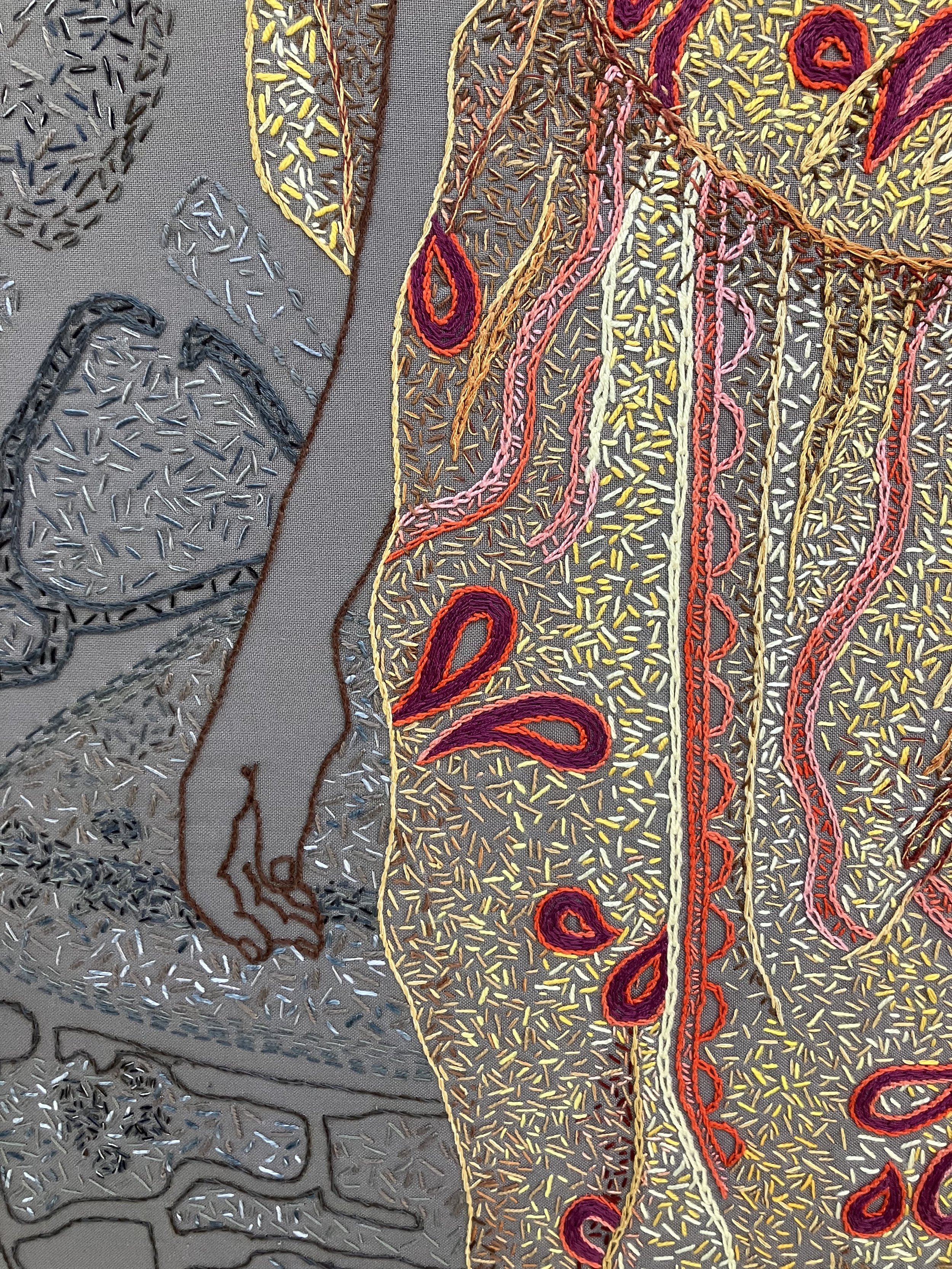 El Geneina references the women and girls killed in El Geneina, Darfur. There are approximately 100,000 stitches in this piece. El Geneina is a city on the border with Chad that came under attack by the Rapid Support Forces and allied Arab militia in 2023. The Janjaweed destroyed Abu’s home, and he managed to flee to a refugee camp in Chad. Later, I was able to assist him financially to get his mother into Chad. I wanted each stitch to represent a woman or girl who has been killed, but trying to find accurate numbers for the people killed in the Darfur conflicts is frustratingly opaque. Genocide estimates vary from 200,000 to 400,000 people. These numbers make my 100,000 stitches seem insignificant. Hibiscus is the national flower of Sudan. I have also used flowers of the umbrella thorn acacia (Sudan’s national tree) and roses that grow well in desert gardens. El Geineina is Arabic for garden. Villages and homes have been bombed and burnt, leaving shadows of what was once there. Images that haunt me from Gaza to Sudan.