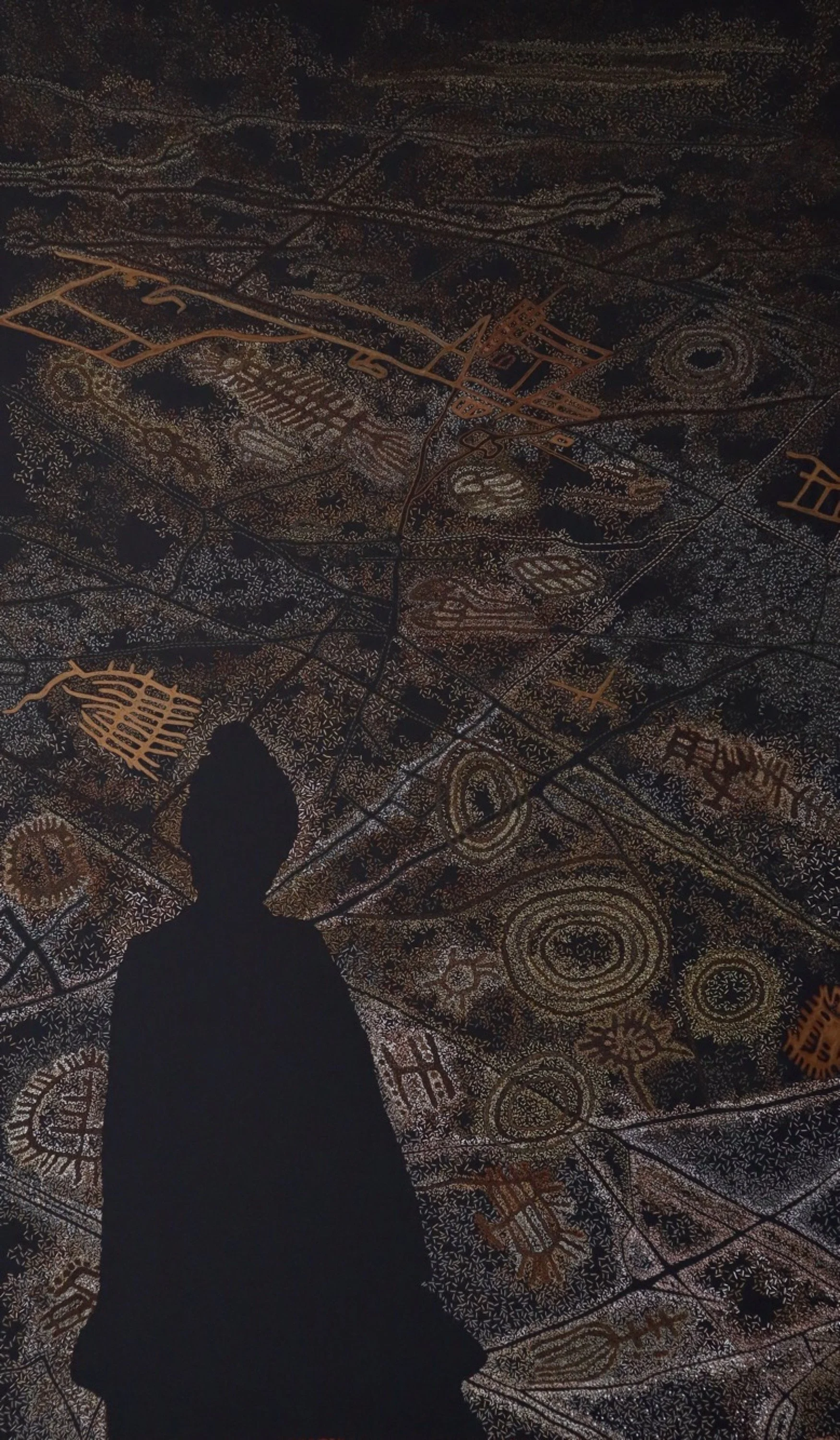 The site is thought to be associated with female initiation, which would take place individually, and involve interaction with a water source and an offering to the water snake and the desire for soft, nurturing “female” rain as opposed to violent, potentially destructive “male” storms. Geometric tattoos done after a period of initiation seclusion would mark the end of puberty rites. The engravings would become animated by water flowing over them, the river's ebb and flow depending on rainfall and drought cycles. The connection between the engravings, tattoos, women and place is central to the panel. The lack of certainty about their origins allows them to live and transform into a contemporary reality, a reflection on internal and external mapping of the environment seen today from aeroplanes at night and on car and cell phone maps. These are all ways that we understand a place, our relationship to it, and reach back with a visual connection to people in the past. The shadow form reflects my meditation on women who are simultaneously present and absent. A shared topophilia between women now and then.